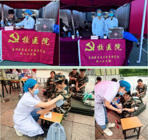 在军训现场,党员先锋岗医务人员克服困难,主动请缨驻点保障。他们顶着酷暑,在训练场边设立临时医疗点,备足防暑降温药品、急救用品。党员同志们轮班值守,密切关注新生身体状况,对出现中暑先兆、运动损伤或身体不适的学生,第一时间进行专业处置、及时转诊,确保突发状况得到快速有效应对。他们耐心讲解防暑知识,指导科学补水,用细致入微的关怀缓解新生的训练疲劳。